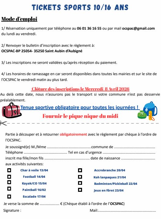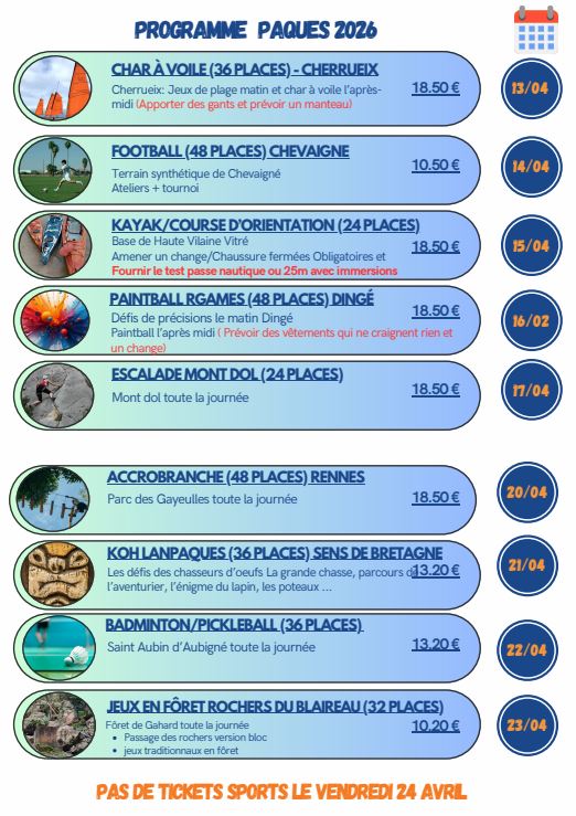 La plaquette des Tickets sports des vacances de Pâques est arrivée. 9 journées sont proposées aux jeunes de 10 à 16 ans.