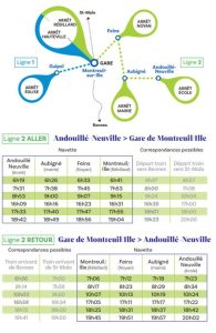 | Les horaires de départ de la navette à ANDOUILLÉ-NEUVILLE : – 6h19 pour le train vers Rennes de 6h47, vers St Malo de 6h57 – 7h31 pour le train vers Rennes de 8h00, vers St Malo de 7h58 – 8h53 pour le train vers Rennes de 9h24, vers St Malo de 10h04 – 16h09 pour le train vers Rennes de 16h35, vers St Malo de 17h00 – 17h33 pour le train vers Rennes de 18h01, vers St Malo de 18h00 – 18h42 pour le train vers Rennes de 19h23, vers St Malo de 20h00 |