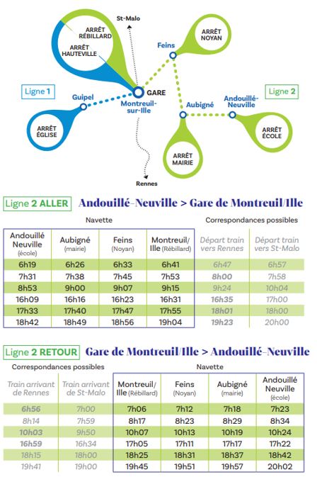 – Ligne 2 : Andouillé-Neuville (école) > Aubigné (mairie) > Feins (Noyan) > Montreuil-sur-Ille (place Rébillard)